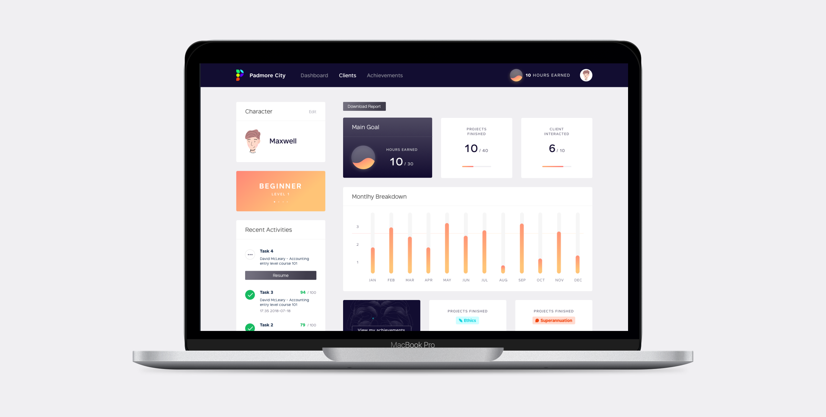 The user interacts with ‘clients’ through a chatbot and is mentored throughout the projects. There are multiple avenues of engagement, from an avatar builder, client videos, images, even emojis. You can track your professional development time through your dashboard, achievements and ‘cognition map’.