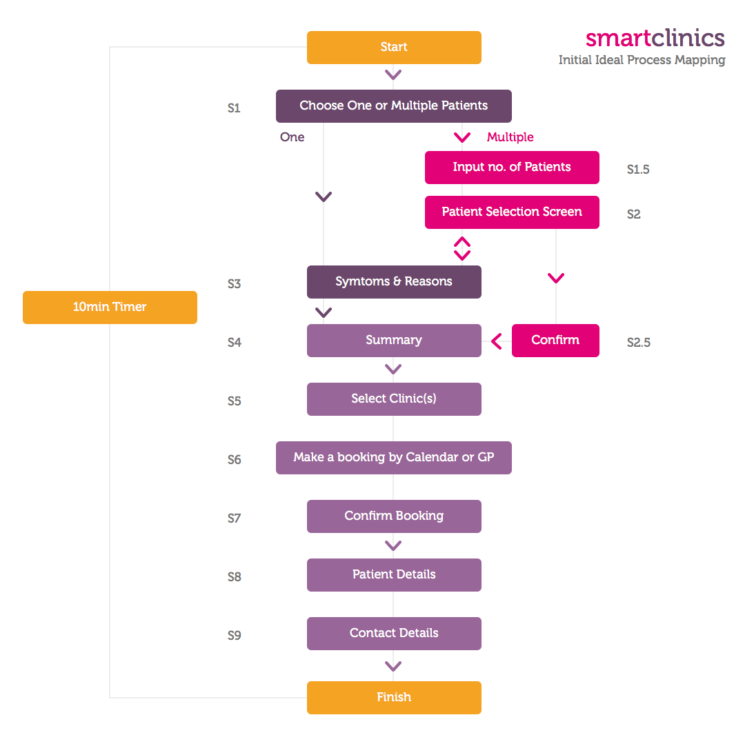 The online booking form developed by Smart Clinics is to help users easily book a GP (General Practitioner) appointment at a nearby clinic, using a laptop or mobile phone. We walked through the process a couple times to map out the logic of the form.