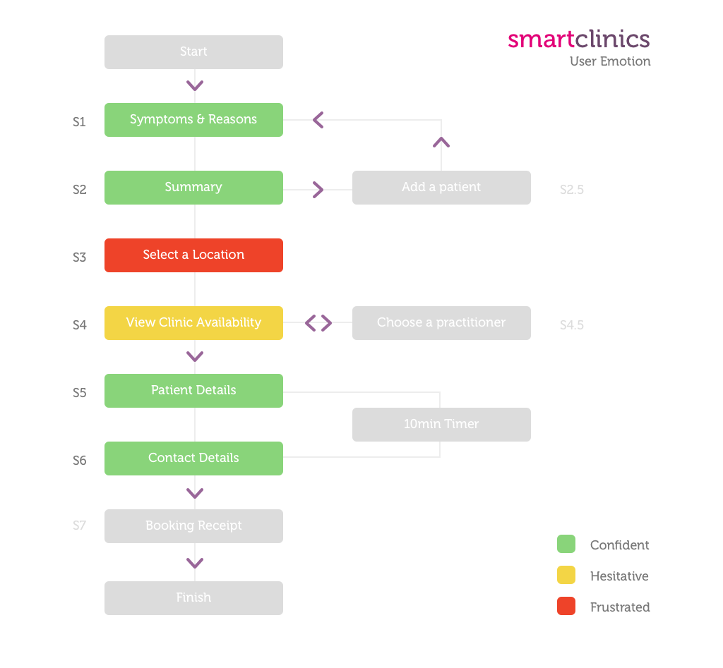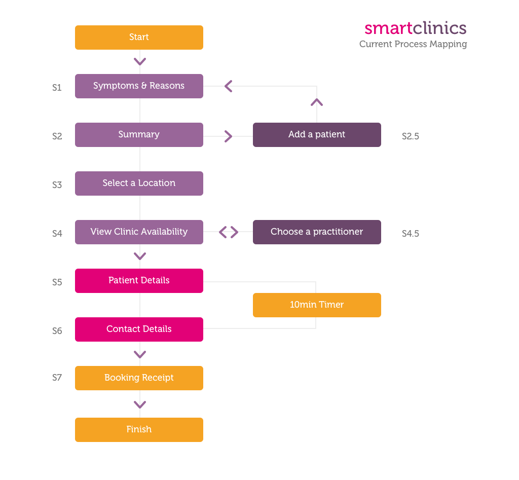 The online booking form developed by Smart Clinics is to help users easily book a GP (General Practitioner) appointment at a nearby clinic, using a laptop or mobile phone. We walked through the process a couple times to map out the logic of the form.